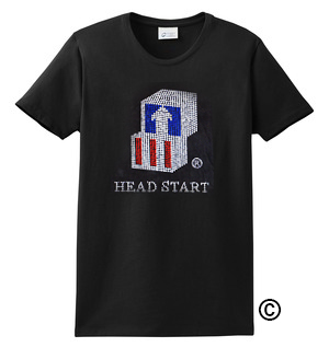 Please allow 2-3 weeks production on wearables and tote bags. Please contact us for rush deadlines. SH226 100% cotton black Ladies t-shirt with rhinestone Head Start Blocks logo