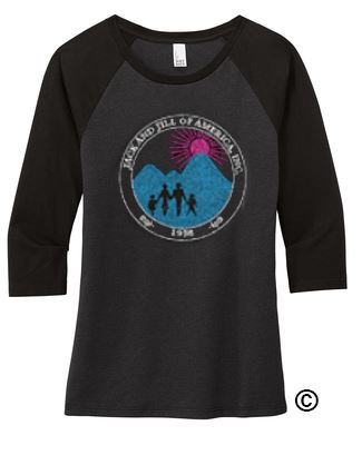 Please allow 2-3 weeks production on wearables and tote bags. Please contact us for rush deadlines. JJSH136RB Black/Black frost ladies raglan 3/4 sleeve t-shirts with full color rhinestone round Jack and Jill logo. A classic raglan perfectly created with tri-blend yarns. * 4.5-ounce, 50/25/25 poly/ring spun combed cotton/rayon