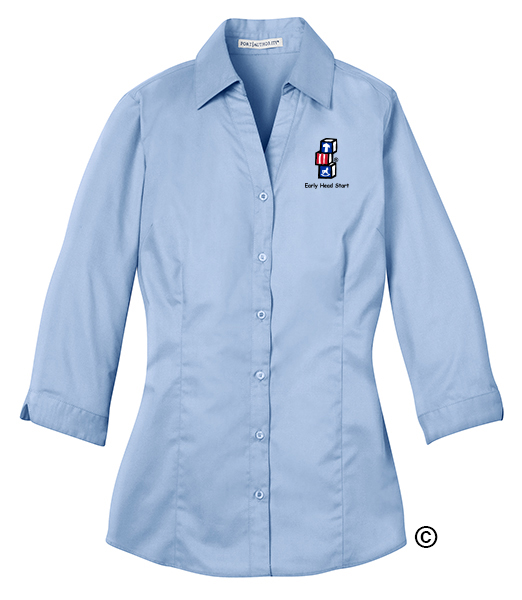 Please allow 2-3 weeks production on wearables and tote bags. Please contact us for rush deadlines. EHS0926BL With a modern fit, this wrinkle-resistant blouse is a must-have basic-pair it with skirts, jeans or khakis. Please note it is a FITTED blouse.